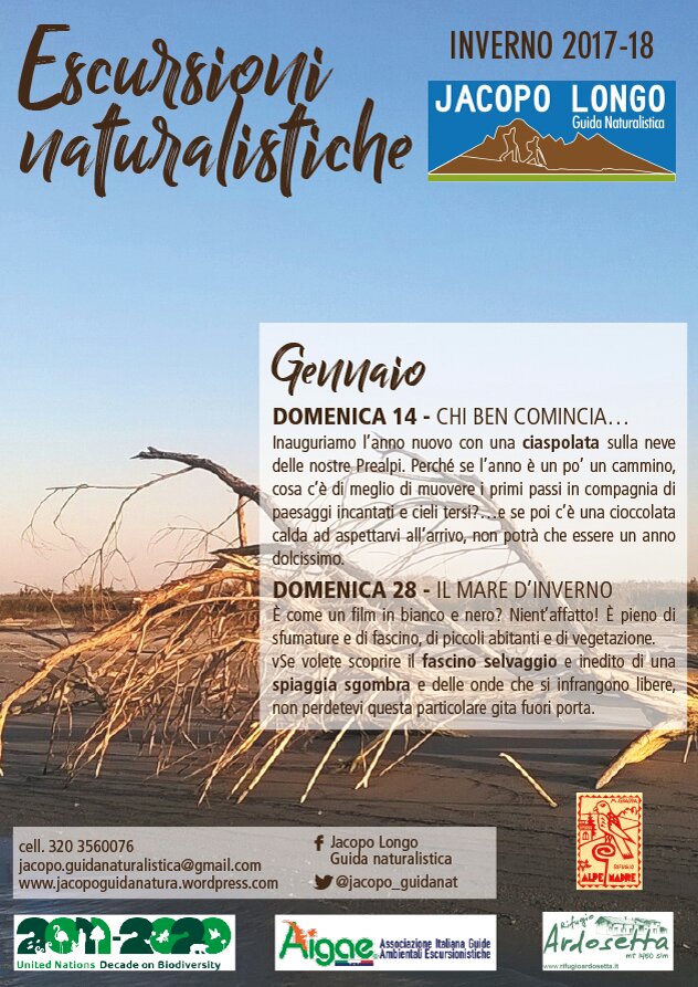 Ecco le proposte per i primi mesi del 2018: due ciaspolate in compagnia, una passeggiata su una spiaggia selvaggia e un’escursione tra montagne e letteratura…