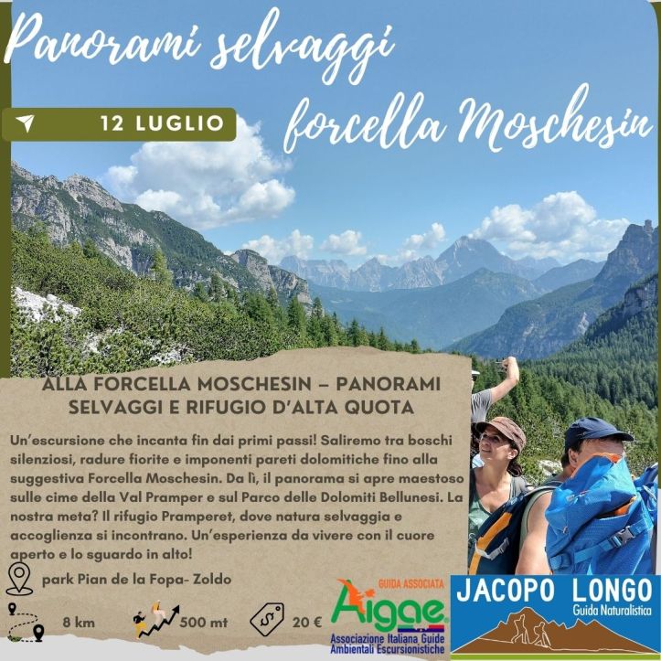 Dal cuore del Parco Nazionale delle Dolomiti Bellunesi, ci incammineremo tra boschi di larici, radure fiorite e pendii selvaggi, fino a raggiungere la spettacolare Forcella Moschesin, uno dei punti panoramici più suggestivi della Val Pramper.