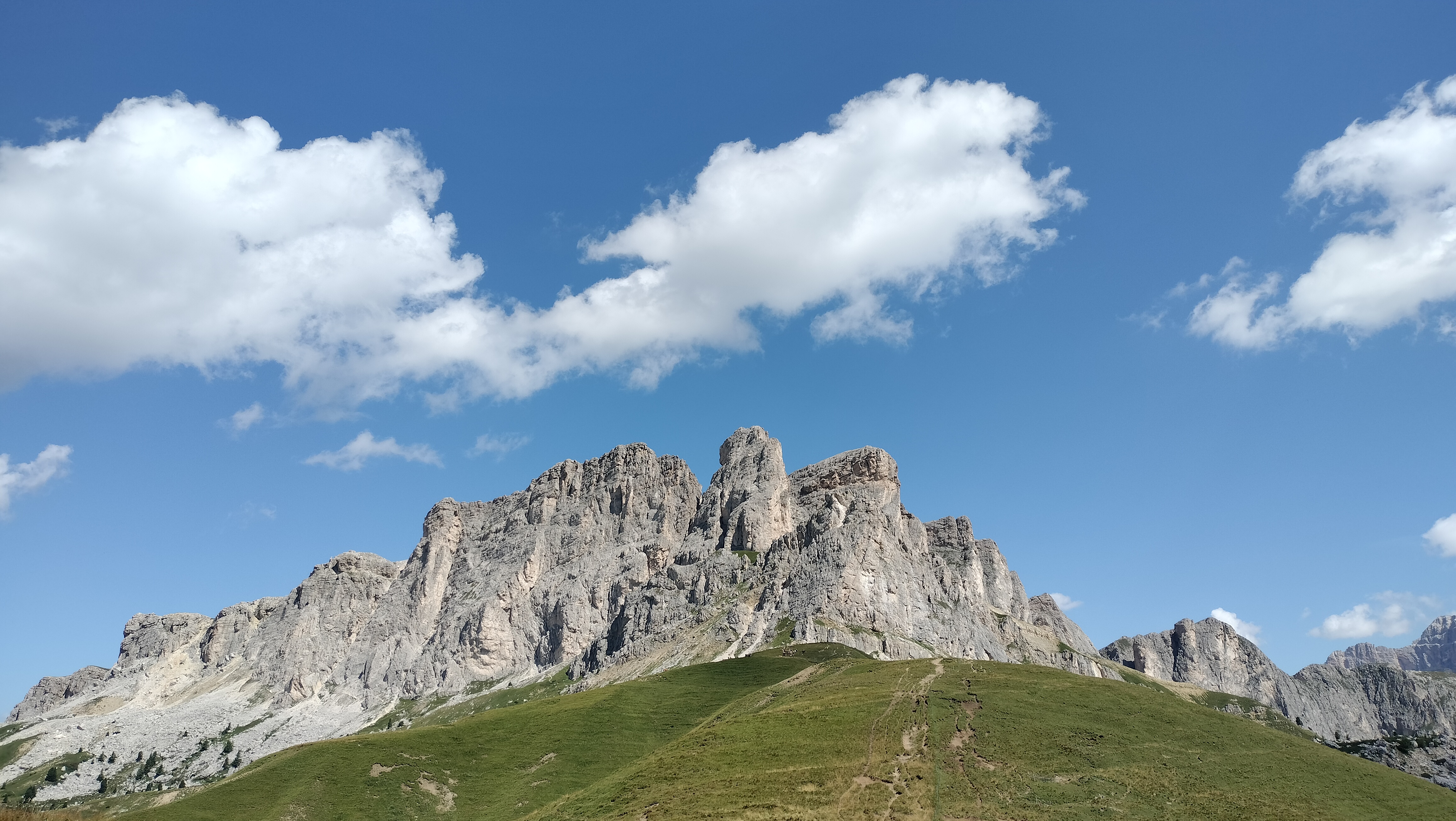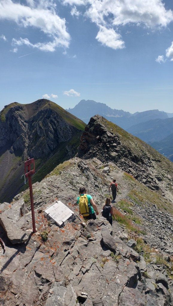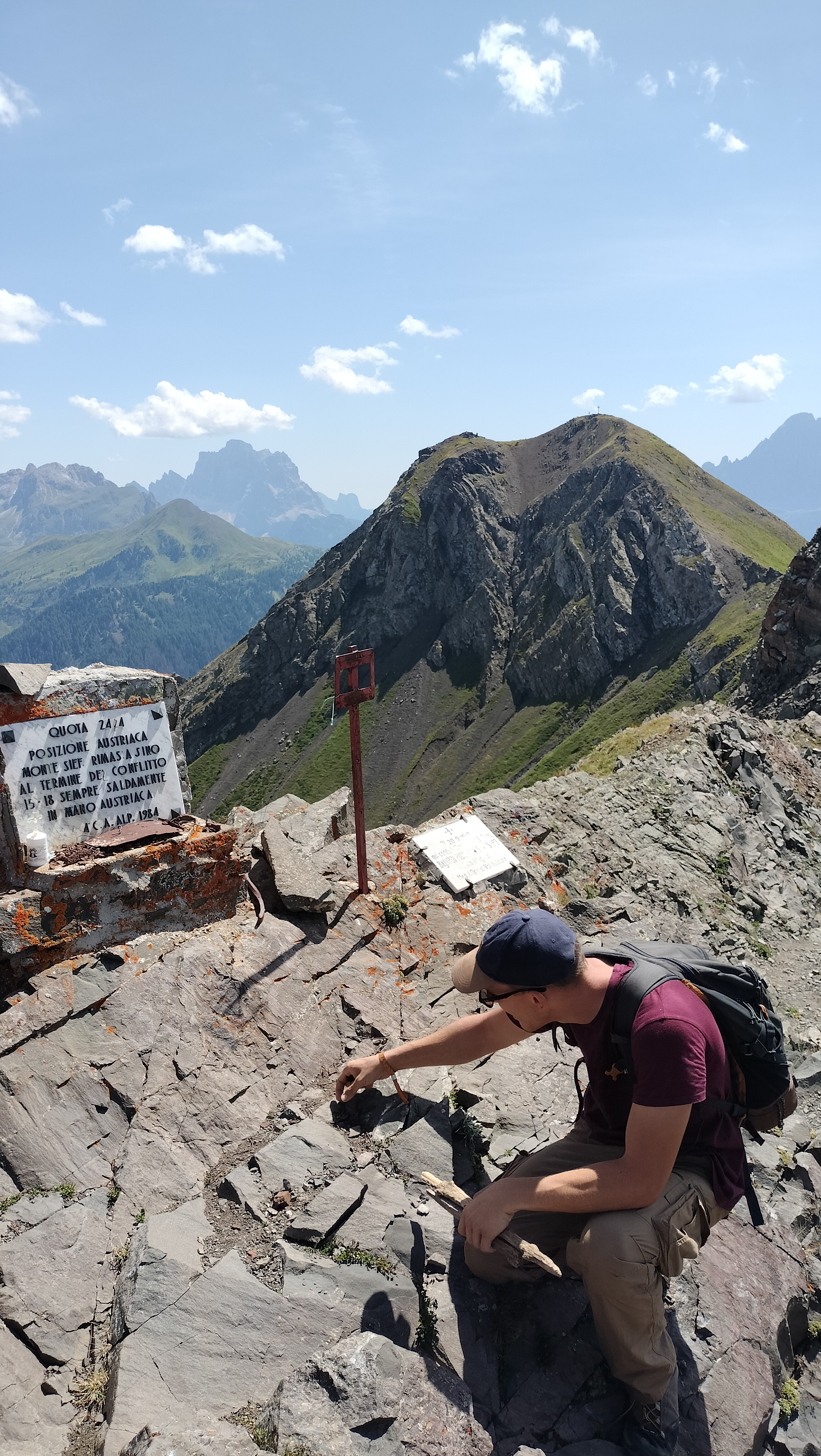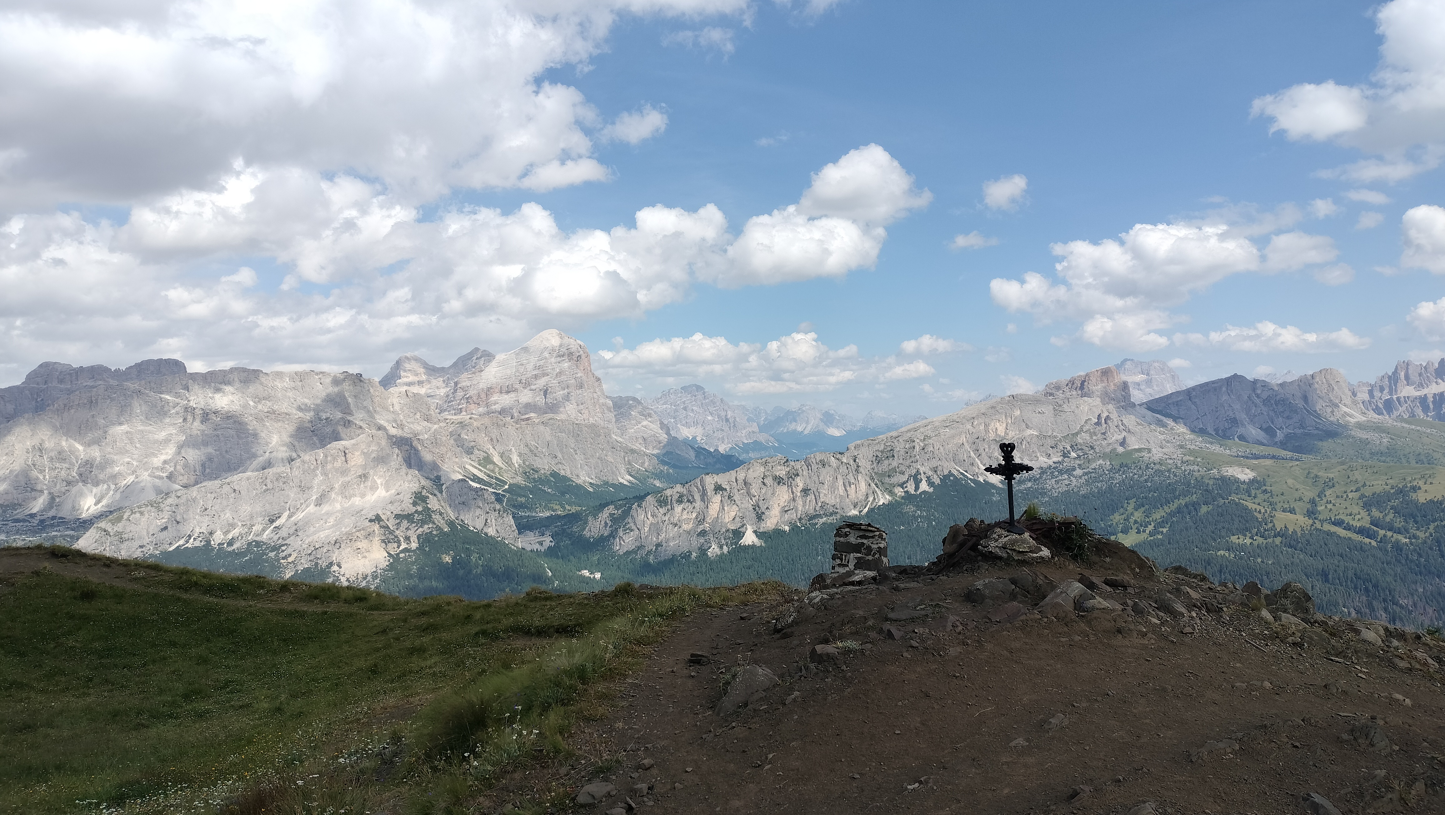Il sentiero sale dolcemente tra prati d’alta quota e resti di trincee, regalando panorami sempre più ampi, fino alla vetta (2.452 m), dove ci accoglie una croce e un panorama grandioso a 360°: Marmolada, Civetta, Pelmo, Tofane e Conturines.