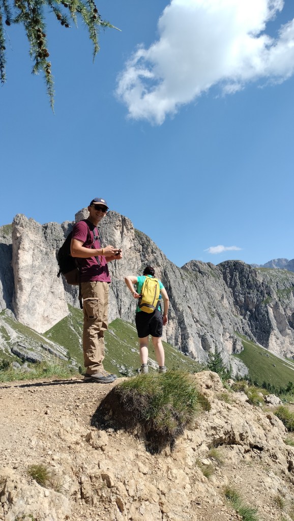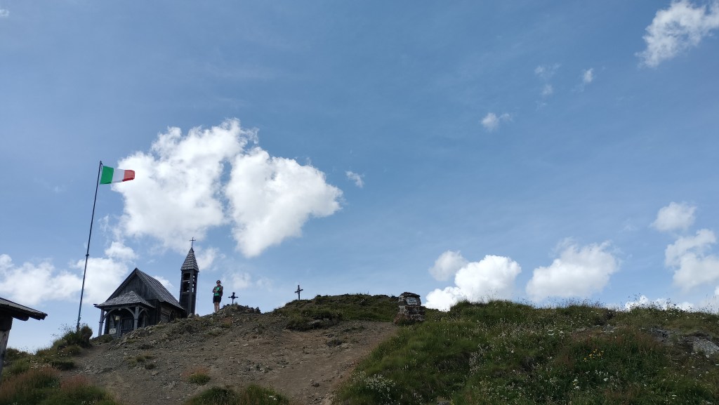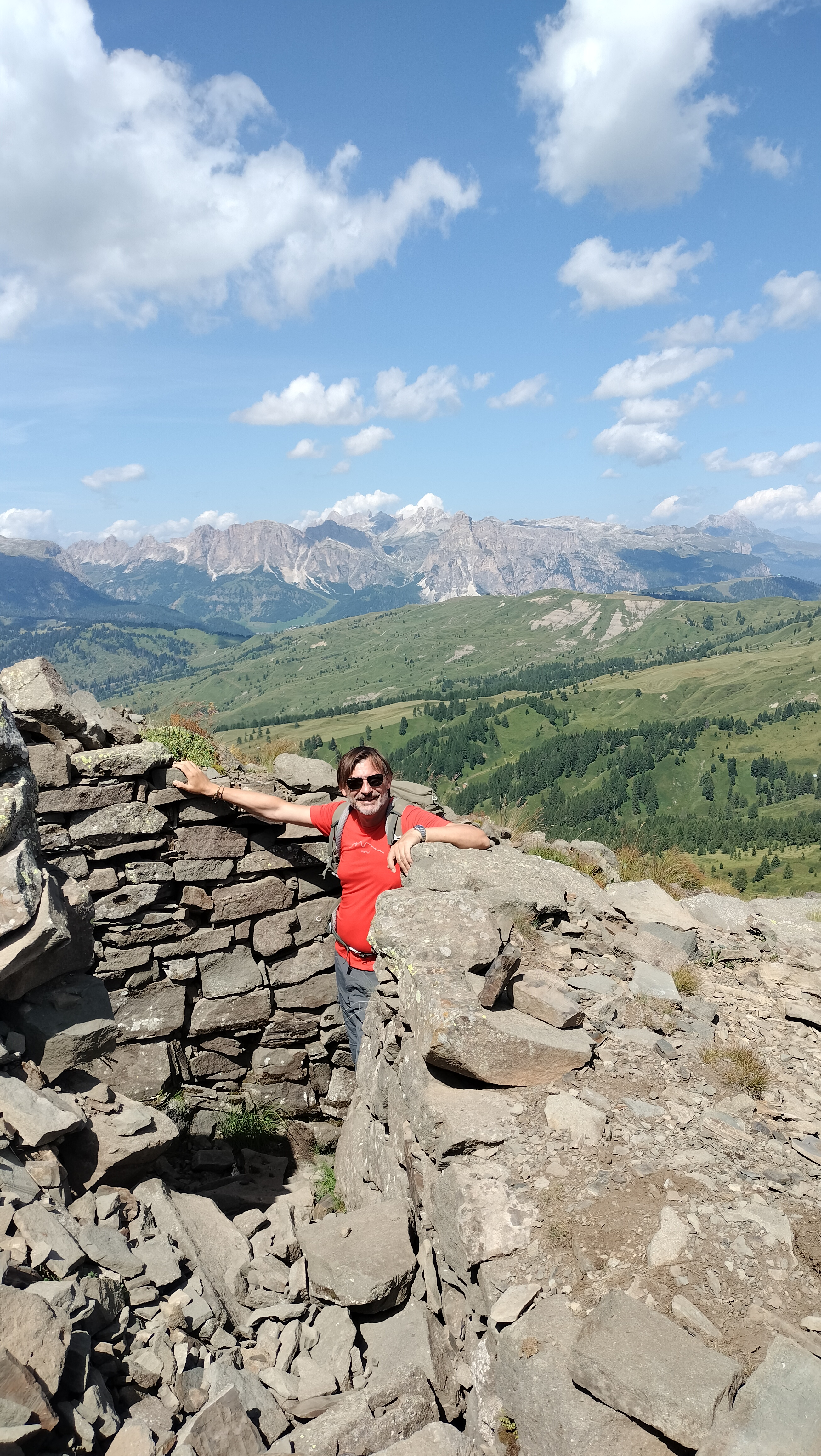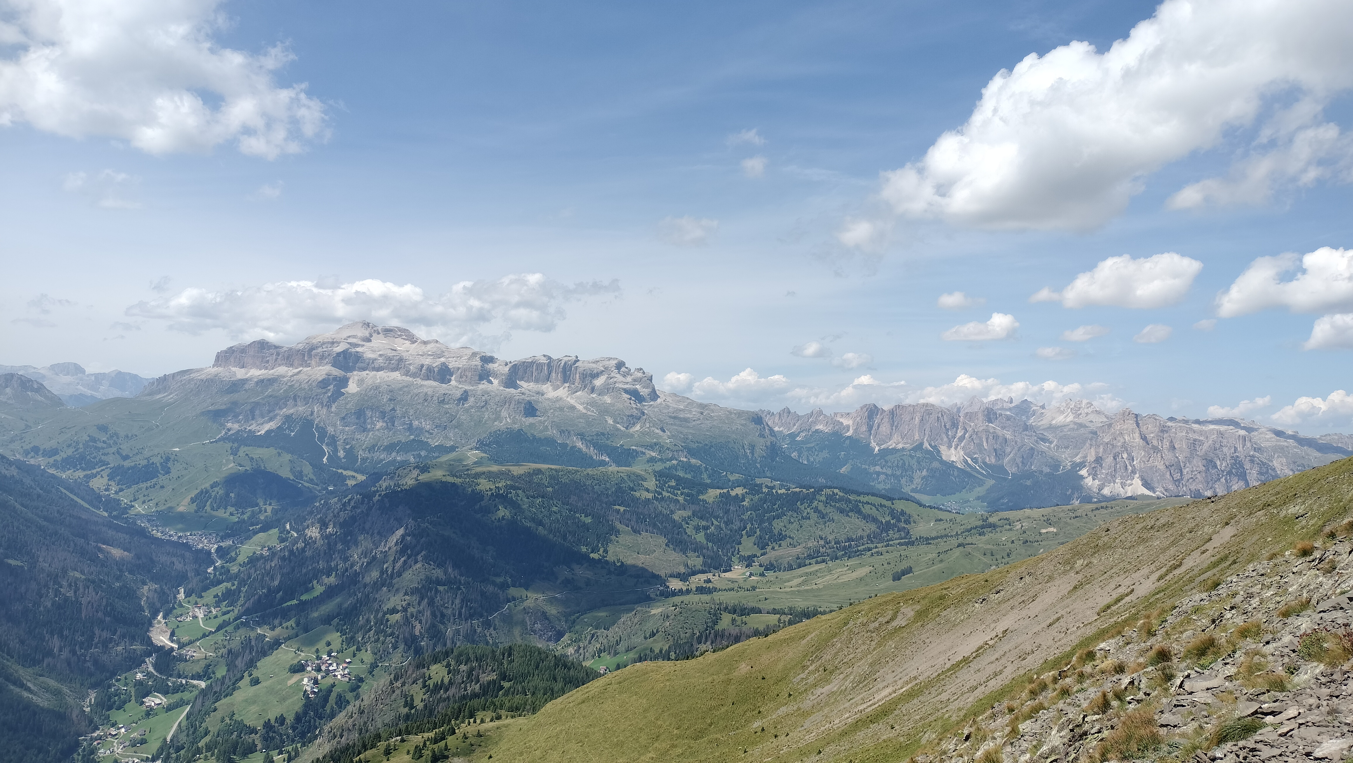 Il sentiero sale dolcemente tra prati d’alta quota e resti di trincee, regalando panorami sempre più ampi, fino alla vetta (2.452 m), dove ci accoglie una croce e un panorama grandioso a 360°: Marmolada, Civetta, Pelmo, Tofane e Conturines.