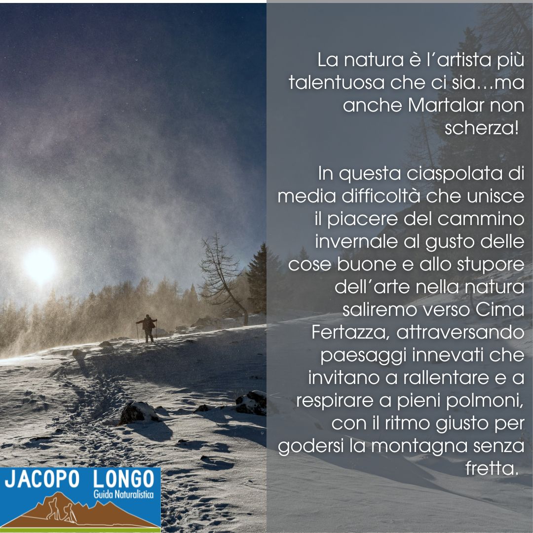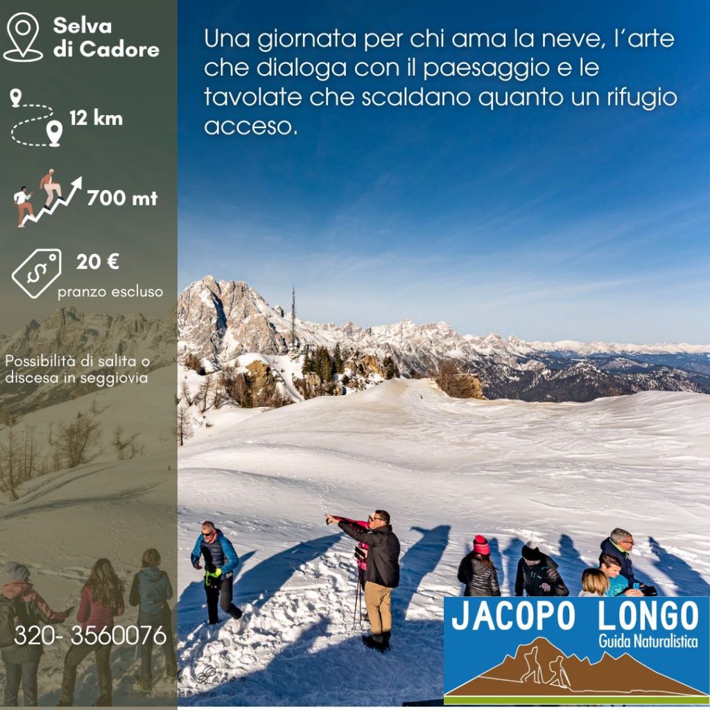 7 febbraio 202614 febbraio 2026jacopoguidanaturalistica ❄️ A CIASPOLARE…CON ARTE! 🦌 ISCRIZIONI Ritrovo ore 9.00 Presso impianti sciistici Selva di Cadore- Pescul Condividi: Condividi su X (Si apre in una nuova finestra) X Condividi su Facebook (Si apre in una nuova finestra) Facebook Mi piace Caricamento... Correlati